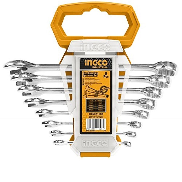 آچارهای رینگی با درگیرشدن کامل با پیچ یا مهره، کارایی و عملکرد بهتری نسبت به آچارهای تخت دارند. حال اگر این نوع آچار قابلیت جغجغهای هم داشته باشد، سرعت عمل کاربر افزایش مییابد. البته با توجه به محل استفاده از آچار، احتمال دارد که امکان استفاده از آچار رینگی وجود نداشته باشد. ست ۸ عددی آچار یکسر رینگ اینکو (ingco) میتوان برای بازکردن پیچ و مهرهی ۶تا۱۹ میلیمتری استفاده کرد. آچارهای مدل HKSPA1088 دارای استاندارد هستند؛ این استاندارد، شامل تست گشتاور آچارهای دوسره است. شرکت اینکو ازجمله عرضهکنندگان مطرح داخلی در زمینهی انواع ابزارهای دستی، بادی و برقی است. این شرکت با معرفی محصولاتی که از نظر کیفیت در سطح قابلقبولی قرار دارند و تهیهی آنها از لحاظ قیمت مقرونبهصرفه هستند، جایگاه مناسبی در بازار ایران برای خود ایجاد کرده است.